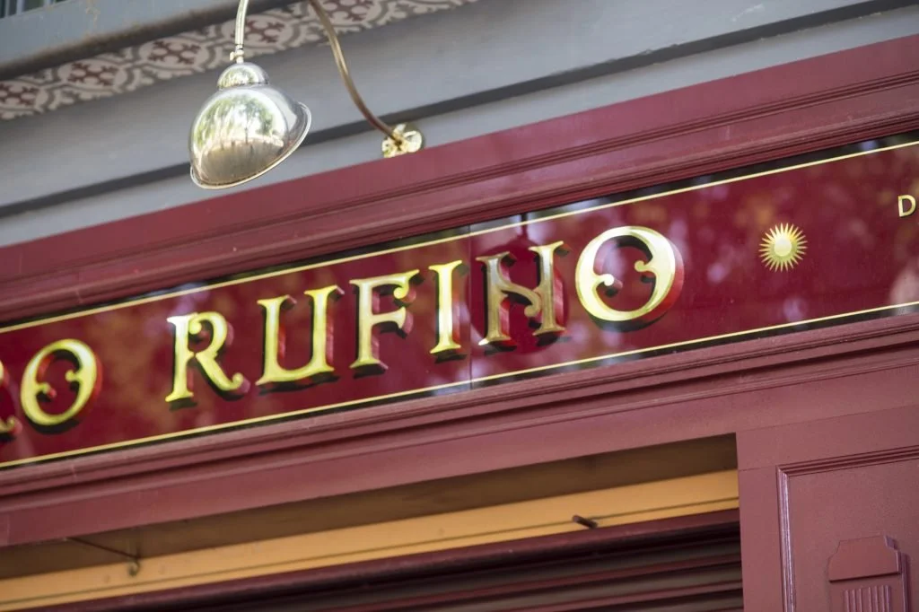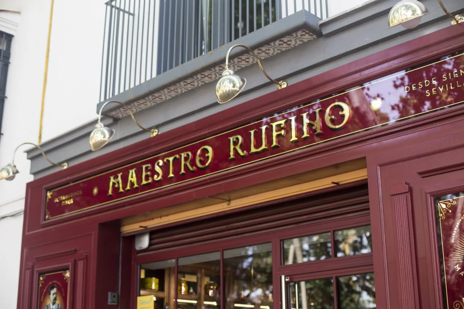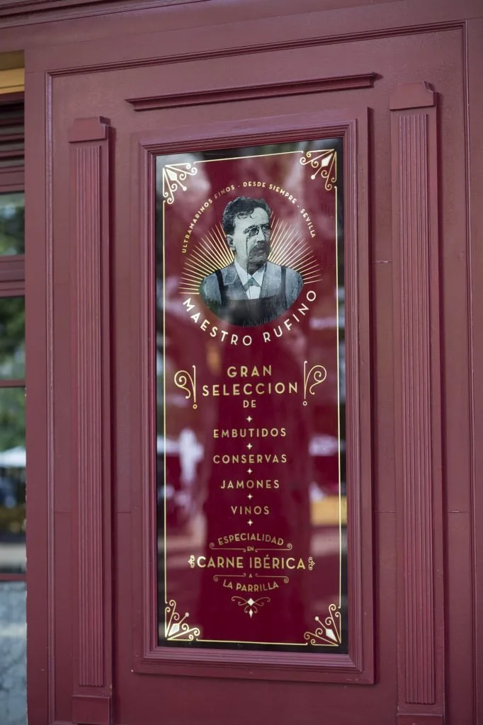Maestro Rufino nos encargaron unos rótulos para su fachada tradicional en Sevilla. La tipografía y el diseño clásico, la serigrafía del retrato… llevados al oro en vidrio, con la carpintería en rojo encajan maravillosamente en el entorno de esta preciosa ciudad.