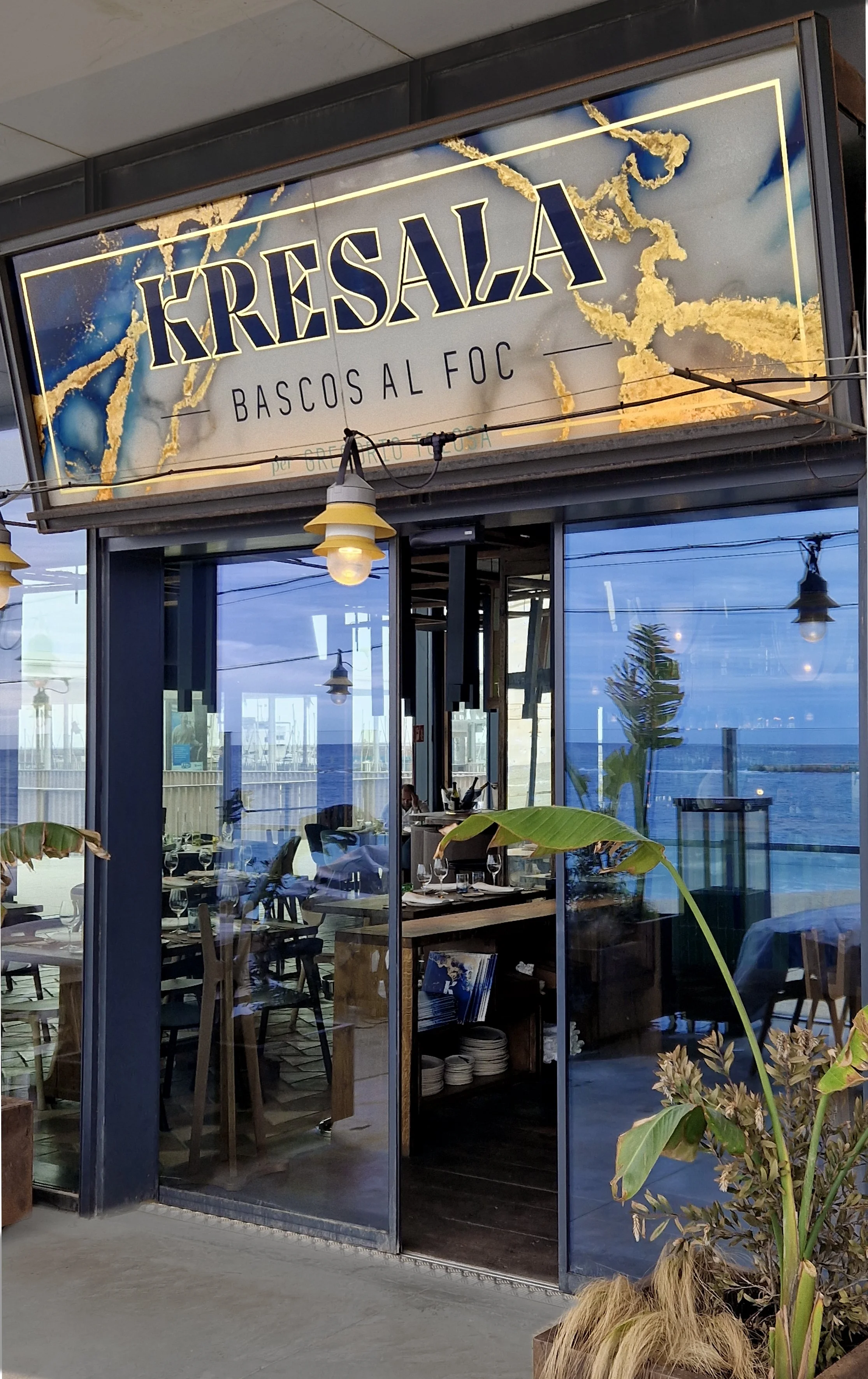 Pintando con esmalte y dorando con pan de oro real los rótulos para Kresala restaurante Barcelona, de Grupo Sagardi. Kresala del mar es un término vasco que evoca la esencia del océano. Literalmente significa "salitre" o "agua salada", pero trasciende a representar la conexión profunda entre el mar, la tierra y el ser humano en la cultura del País Vasco. Para vascos, especialmente vizcaínos, encarna la fusión mística del hombre con el mar Cantábrico: un manto protector de espuma y sal que regala bruma y vida