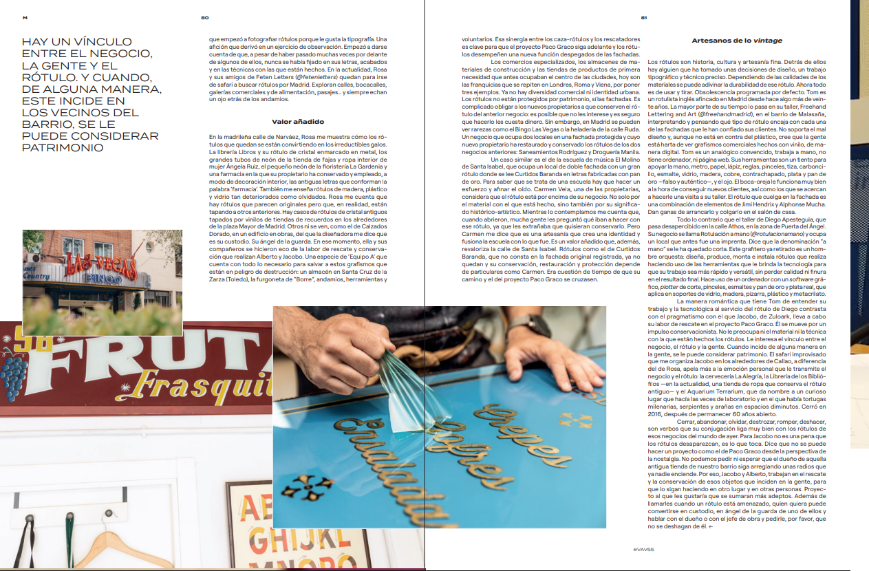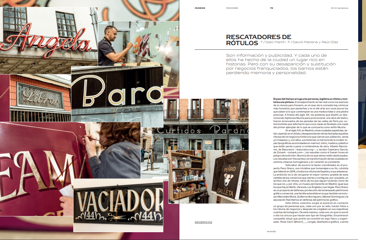 El paso del tiempo arruga a las personas, legitima un chiste y revaloriza una pintura. El envejecimiento es tan real como los avances de la ciencia para frenarlo, en el caso de la comedia hay cómicos más honestos que pacientes y en el del arte son unos pocos los que saben si lo que contemplan es una mediocridad o una piedra preciosa. A finales del siglo XIX, los pósteres que diseñó un desconocido Alphonse Mucha para promocionar una obra de teatro, fueron arrancados de las paredes de las calles de París por coleccionistas que adivinaron que a sus casas se llevaban una copia del primer ejemplar de lo que se conocería como estilo Mucha. En el siglo XXI, en Madrid y otras ciudades españolas, están cayendo en el olvido y desapareciendo de las fachadas aquellos rótulos de los negocios históricos que cierran por jubilación, venta y/o traspaso; y, con ellos, sus historias, la memoria de la ciudad. Joyas tipográficas acomodadas en mármol, vidrio, madera y plástico que están yendo a parar a contendores de obra. Alberto Nanclares, de Basurama —basurama.org—, y Jacobo Cayetano García, de Zuloark —zuloark.com—, los rescatan como si fueran linces en peligro de extinción. Muchos de los que salvan están destrozados. Los rescates son frecuentes y la transformación de las ciudades en centros urbanos homogéneos y sin carácter es constante. Esta labor de socorro la hacen coordinados en el proyecto Paco Graco, una iniciativa que homenajea a su tío, rotulista que falleció en 2016, a todos los rótulos de España y a sus artesanos. La ambición es la de recuperar el mayor número posible de esos carteles de los comercios que cierran y configurar, por una parte, un archivo vivo de rótulos, tanto de los que siguen luciendo como de los que no; y, por otra, un museo permanente en Madrid, igual que los que hay en Berlín, Varsovia, Los Ángeles y Las Vegas. Paco Graco es un proyecto de defensa y protección del amenazado patrimonio gráfico comercial, una familia extensible en la que también se incluyen Mercedes Moral, Guillermo Borreguero, Manuel Domínguez y la asociación Red Ibérica en defensa del patrimonio gráfico. Este último colectivo surgió al ponerse en contacto un grupo de personas que, cada uno por su lado, hacían fotos a los rótulos de negocios y después las colgaban en sus respetivas cuentas de Instagram. De esta manera, cada uno vio que no era él o ella los únicos que hacían ese tipo de fotografías. Encontraron compañía virtual que pronto se convirtió en algo físico y organizado. Rosa Carril (@carril___conga), diseñadora gráfica, cuenta MUNDOS M 80 81 #VAV55 que empezó a fotografiar rótulos porque le gusta la tipografía. Una afición que derivó en un ejercicio de observación. Empezó a darse cuenta de que, a pesar de haber pasado muchas veces por delante de algunos de ellos, nunca se había fijado en sus letras, acabados y en las técnicas con las que están hechos. En la actualidad, Rosa y sus amigos de Feten Letters (@fetenletters) quedan para irse de safari a buscar rótulos por Madrid. Exploran calles, bocacalles, galerías comerciales y de alimentación, pasajes… y siempre echa un vistazo detras de los andamios.